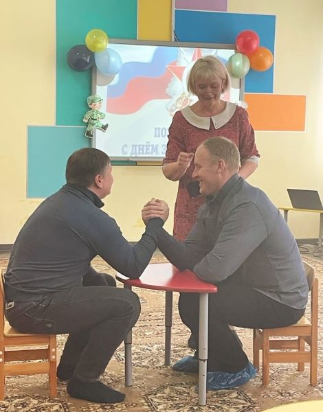 Папы и дедушки так же участвовали в конкурсах, где показали свою богатырскую силу и смекалку. Психолог М. В.Чиркина провела с ними психологические задания, с которыми они отлично справились.