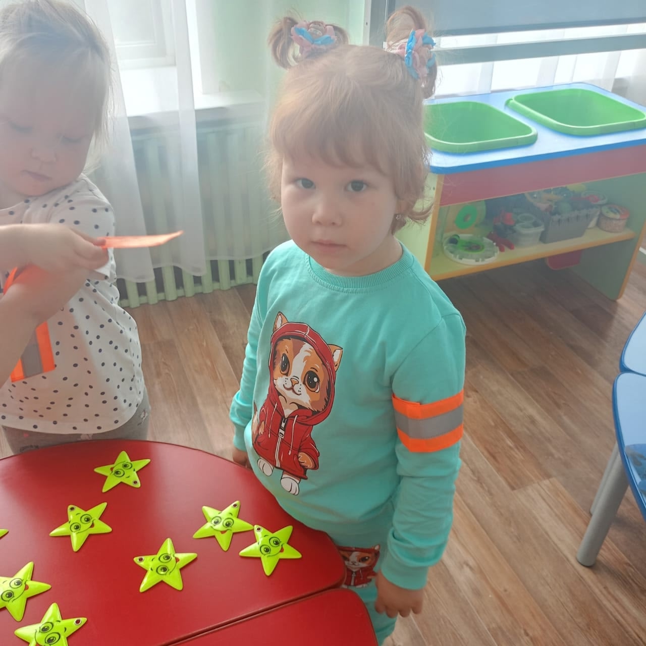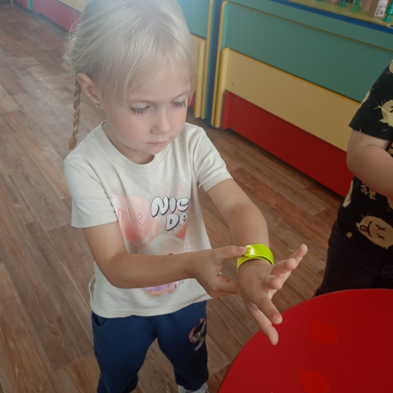 В этот день воспитанники группы от 4 до 5 лет вместе с воспитателем Сажневой О. И. постарались самостоятельно изготовить световозвращающий атрибут. Вместе с детьми организовали выставку световозвращателей и рассмотрели брелоки, наклейки, стикеры, браслеты, липкие ленты, познакомились, как правильно нужно прикреплять фликеры к верхней одежде, рюкзакам и сумкам.